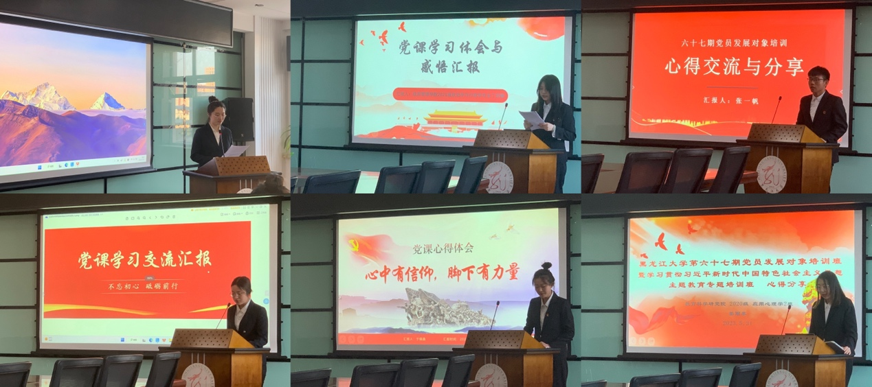 党员发展对象代表于佩淼、丁若晴带领大家回顾第六十七期党员发展对象专题党课的主要内容,结合自身实际,号召大家主动学习党的创新理论,充分发挥榜样引领作用。最后,教育科学研究院党员发展对象代表张一帆、姜雨非结合学习《习近平新时代中国特色社会主义思想专题摘编》、情景研学、志愿服务等活动分享学习心得,表示在未来的学习和生活中保持先锋意识和向上精神,努力成为全面发展的社会主义建设者和接班人。