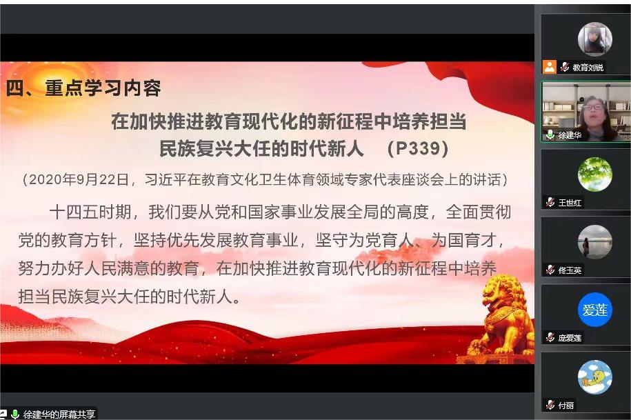 徐建华同志以“马克思主义中国化的最新理论成果——学习贯彻《习近平谈治国理政》第四卷感悟”为主题,从概述、内容结构与逻辑结构、体现的特点、重点学习内容和如何开展学习五个方面进行讲解,重点领学了《习近平谈治国理政》第四卷关于“以保障和改善民生为重点加强社会建设”有关论述:《在加快推进教育现代化的新征程中培养担当民族复兴大任的时代新人》,她结合自己工作实际和高等教育研究方向,与大家分享了学习体会。培育时代新人是教师的使命任务,不断深化高校人才队伍建设改革,建设高素质教师队伍。读懂用好《习近平谈治国理政》第四卷要把握其精神脉络,紧扣时代发展特征,体悟真理的说服力。党支部将通过自学、集中学习、交流讨论、参加专题辅导等方式持续开展学习。领学后,与会人员进行交流学习,并纷纷分享心得。