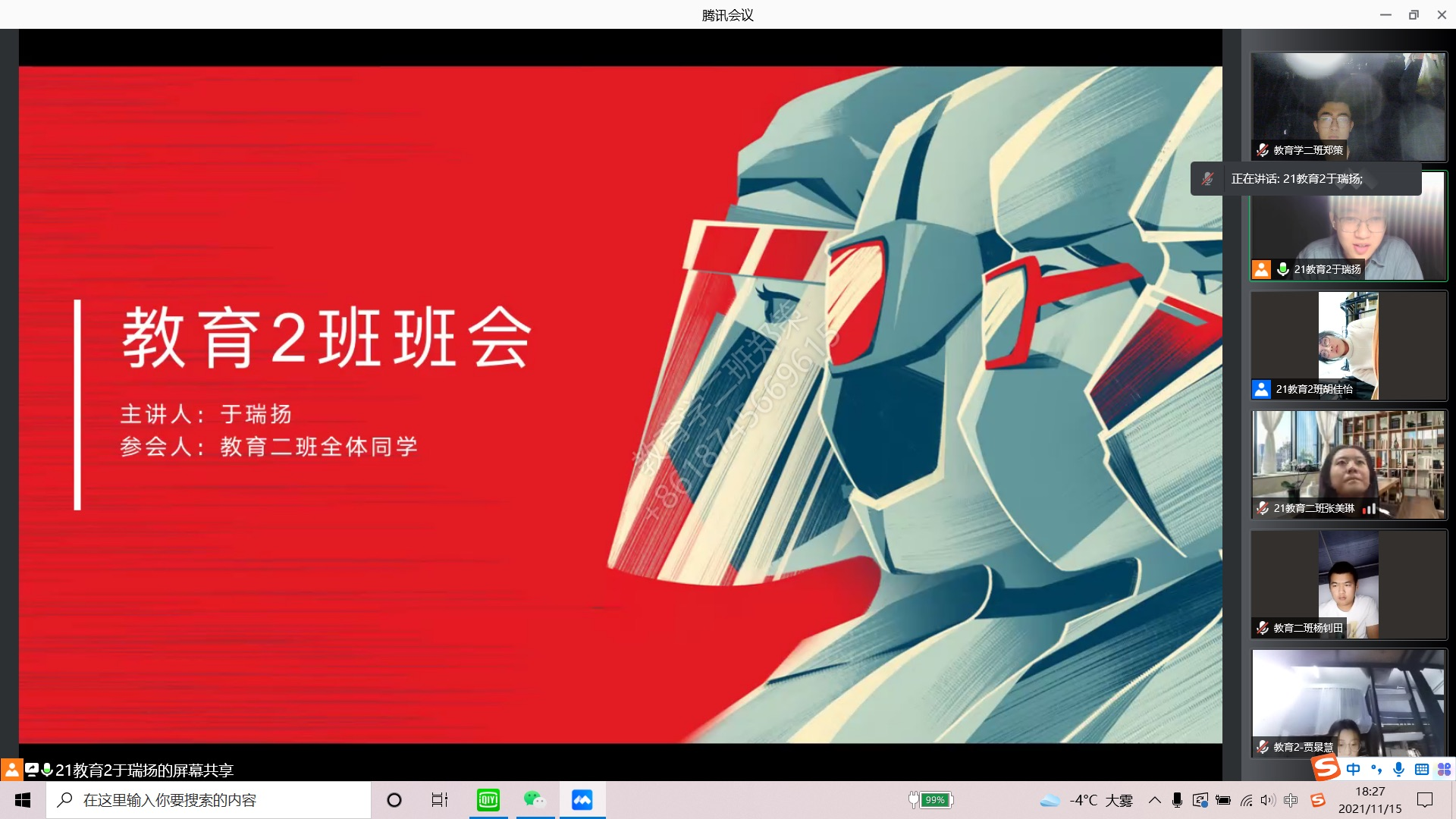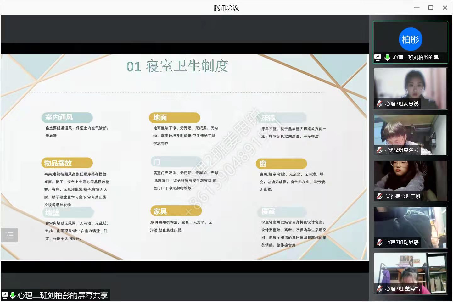 为进一步帮助2021级新生更加科学地规划大学生活,明确学习目的并树立奋斗目标,2021年11月15日18时30分教育科学研究院于腾讯会议平台召开第二次班会,班会由2021级各班班长主持,各班班长、生活委员、学习委员主讲。本次班会共分为三个部分,分别为集体学习《乐鱼