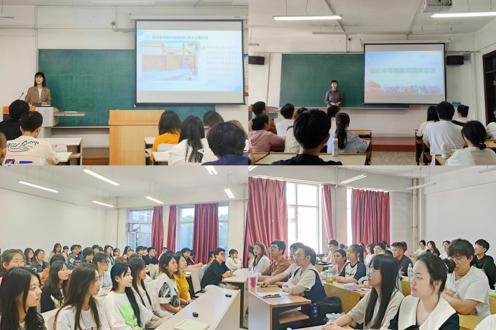 授课过程中,两位老师引经据典说理论,学以致用重思政,从铸牢中华民族共同体意识的时代背景和重大意义、铸牢中华民族共同体意识的深刻内涵、铸牢中华民族共同体意识的实践路径三个方面展开系统讲授。她们勉励同学们要深刻学习领会习近平总书记关于铸牢中华民族共同体意识重要论述的丰富内涵、核心要义和实践要求,切实增强贯彻落实的政治自觉、思想自觉、行动自觉。当今世界百年未有之大变局加速演进,中华民族伟大复兴进入关键时期,铸牢中华民族共同体意识、推进新时代党的民族工作高质量发展,是全党全国各族人民的共同任务,她们引导学生要树立正确的国家观、历史观、民族观、文化观、宗教观,增强国家意识、公民意识、法治意识。