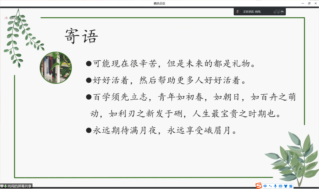 随后,尚闯同学以“大学学习应该设定明确的目标,大学学习应该抱有绝对的自主”为主题进行经验分享。他表示,在大学生活中,学习目标在一定程度上决定了最终学习的结果,大学生应当明确学习目标,从宏观到微观,将目标细分,积淀勤奋与刻苦,最终收获成功的果实。时光不容蹉跎,人生不应懈怠,路遥知马力,大学生应时刻准备着。