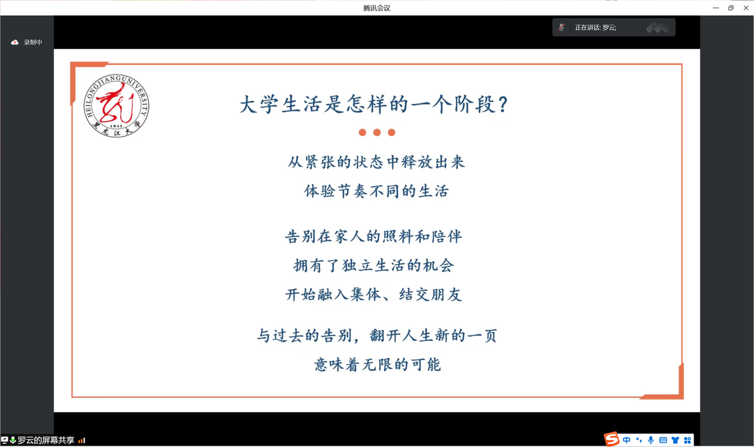 紧接着,罗云同学认为大学这一阶段具有特殊性,要把握好这一特殊时期,鼓励新生们尽可能地提升自己,为未来的学业与工作做好长足的准备。同时,她也建议新生们在学习之余,要广交益友,择其善者而从之,善于发现他人身上的闪光点并虚心求教,促进自身德智体美劳全面发展,做新时代的新青年。
