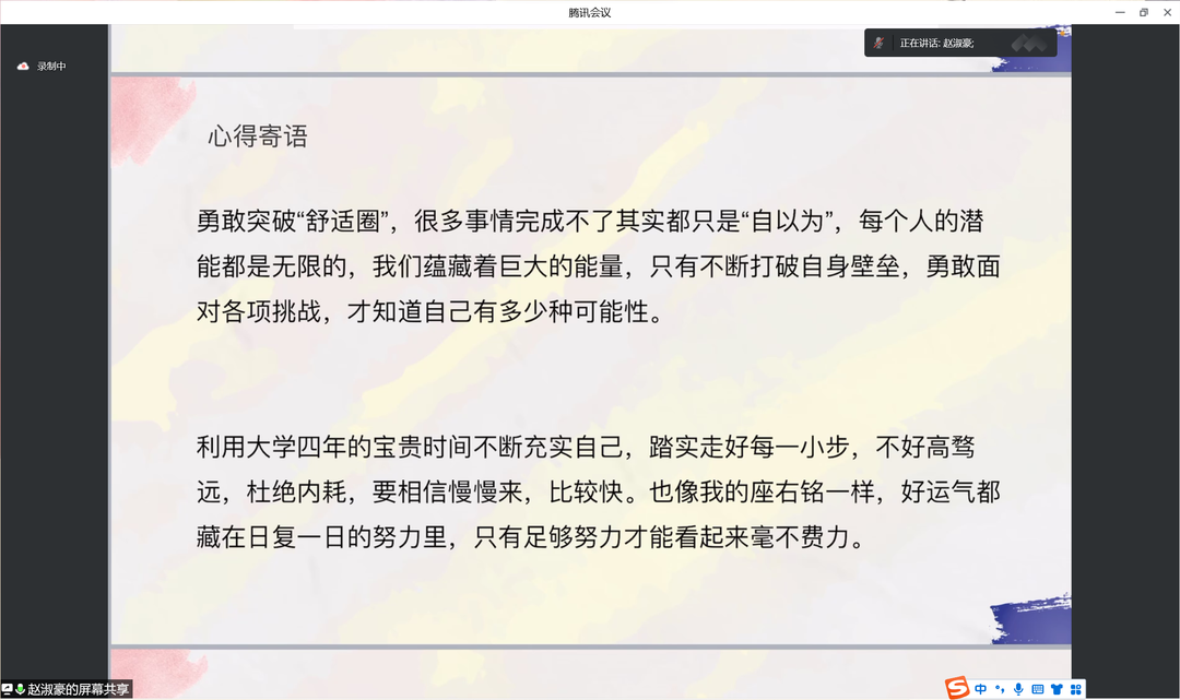 最后,赵淑豪同学讲述了自己的大学经历,向新生们分享自己对大学生活的感悟。她认为,长路漫漫,前方的道路充满未知,当我们面对挑战时,应坚定信念,不轻言放弃。同时我们也要敢想敢做,不畏挫折,时光转瞬即逝,青春不可被辜负,年华不应被虚度,时不我待,作为青年学生的我们应抓住每一个机会,参加各类活动,不断地提高自己的能力,发展自己的优势,补足自己的劣势,不负青春,不负韶华。