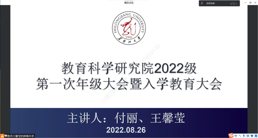 情况,迅速适应大学生活,促进新生入学教育顺利开展,教育科学研究院于2022年8月26日上午9时召开“逐梦青春,启航教育”2022级新生年级大会暨入学教育大会。本次会议由2022级辅导员王馨莹老师主持,院党总支副书记付丽、新生带班任以及2022级全体新生参会。本次大会分为三个议程。