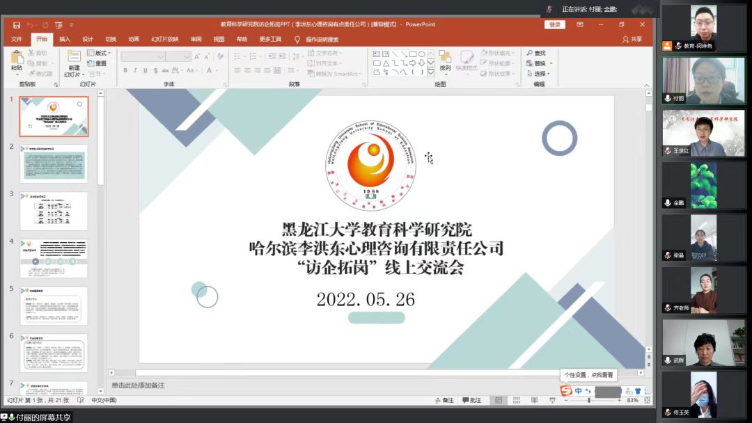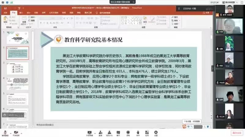 教育科学研究院同哈尔滨李洪东心理咨询有限公司于2022年5月26日14时通过腾讯会议开展“访企拓岗”线上交流会。本次会议由院党总支副书记付丽主持,院党总支书记金鹏,院长王世红,副院长佟玉英,2018级、2020级辅导员梁曼,2019级辅导员闵诗尧,以及代表哈尔滨李洪东心理咨询有限公司的齐总监和武经理出席参加。