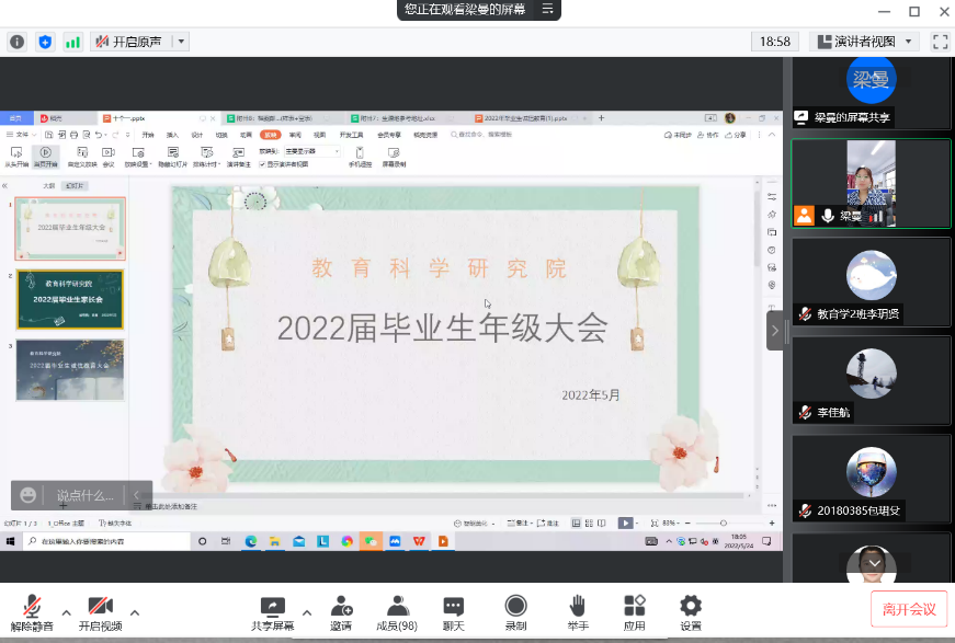 为部署2022届毕业生现阶段各项工作,切实做好疫情防控形势下毕业生的教育管理和文明离校工作,保障毕业生离校工作的顺利进行,教育科学研究院于2022年5月24日18时在腾讯会议召开2022届毕业生年级大会,此次会议由2022届辅导员梁曼老师主持,全体毕业生参加会议。