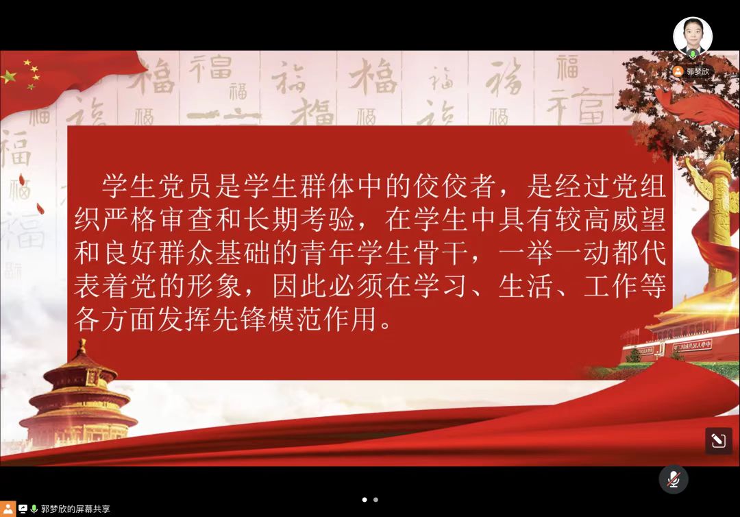 郭梦欣同学以《学生党员应该如何发挥先锋模范作用》为题,将内容分为四个部分:首先,在政治上起到先进作用,保持和发挥一名大学生党员的先锋模范作用,首要的是应认真学习贯彻党的基本理论、基本路线、基本纲领和各项方针政策。结合党员身份,创新学习形式与方法,关注时事,提高自身政治文化素养,阅读书籍,欣赏影视作品,通过立体化的方式进行学习。第二,在学习上起到楷模作用,从小事着手,做到学习目标明确、学习态度端正、学习方法高效,积极参加乐鱼