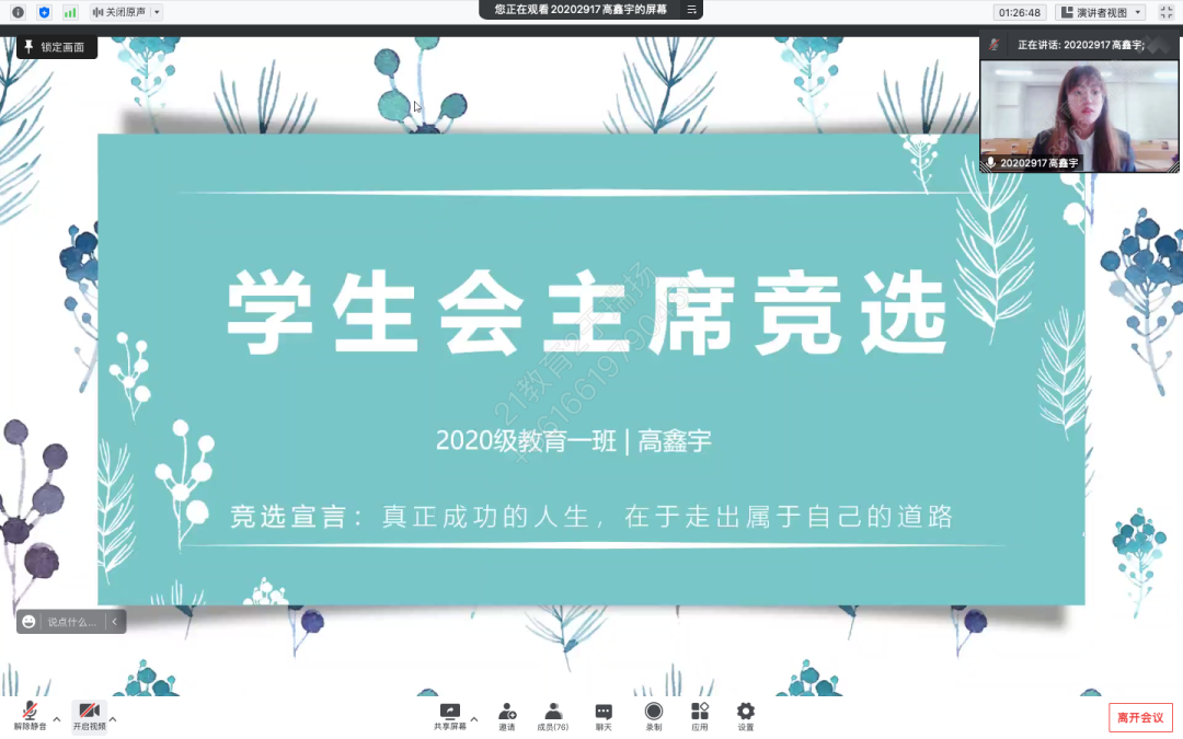 结果公布后,教育科学研究院第十九届学生会主席高鑫宇同学、第五届青年志愿者协会主席齐琪同学依次发表就职演讲。两位同学对乐鱼