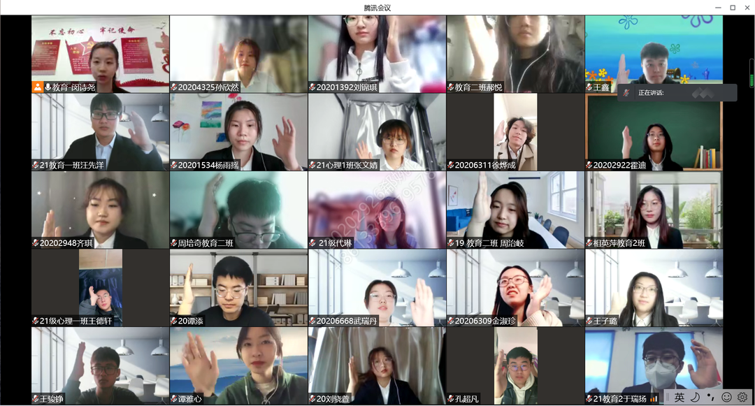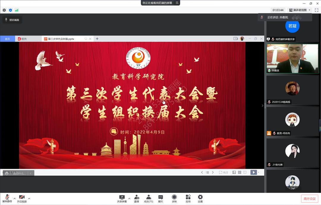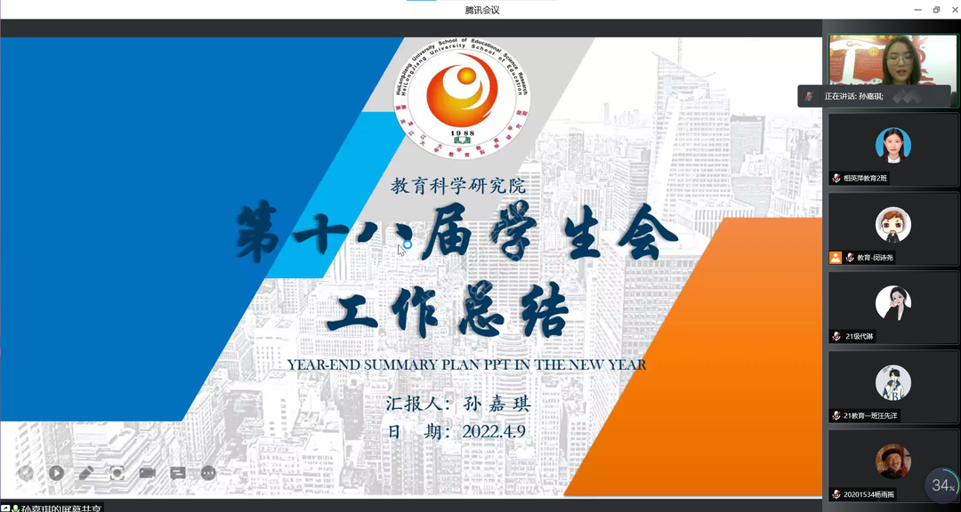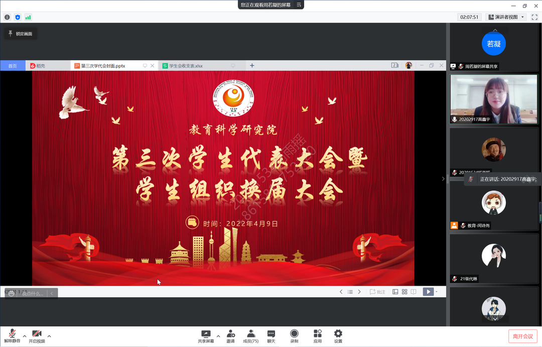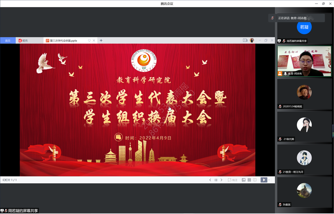 学生组织干部的综合能力,教育科学研究院于2022年4月9日上午9时,通过腾讯会议平台召开第三届学生代表大会暨第十九届学生会、第五届青年志愿者协会主席团换届选举大会。