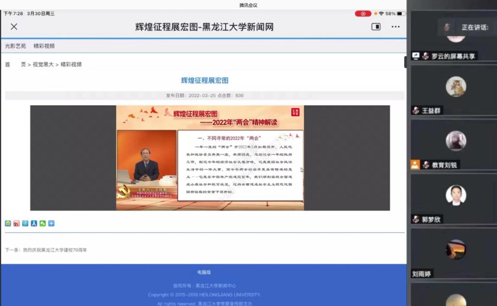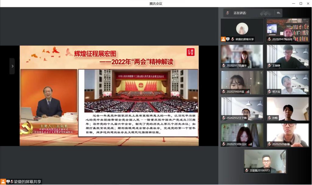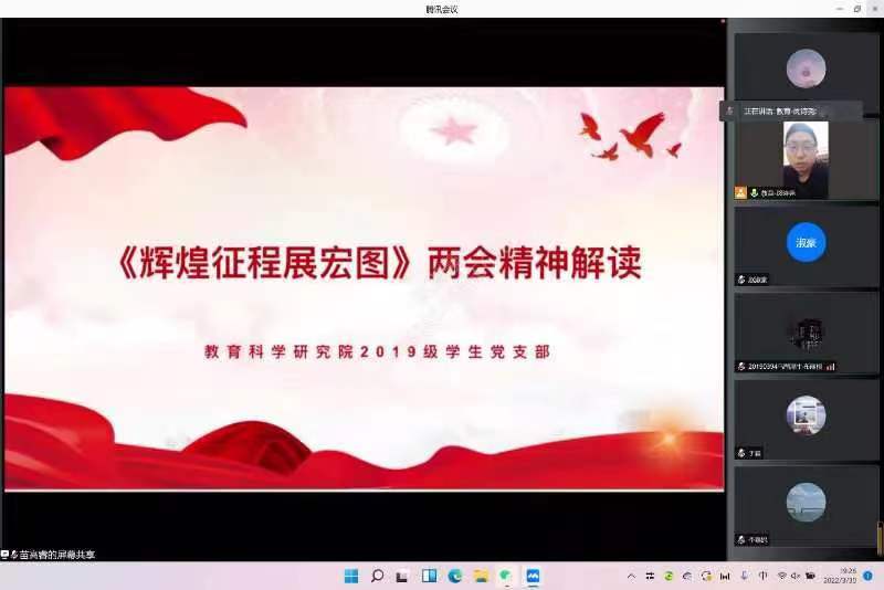 为全面贯彻两会精神,紧跟时代步伐,深入学习两会精神和习近平新时代中国特色社会主义思想。教育科学研究院各学生党支部结合《辉煌征程展宏图》讲座分别于腾讯会议平台开展两会精神专题学习研讨会。本次研讨会分别由各年级学生党支部书记刘锐、闵诗尧、梁曼、王馨莹主持会议,各支部全体党员参会。