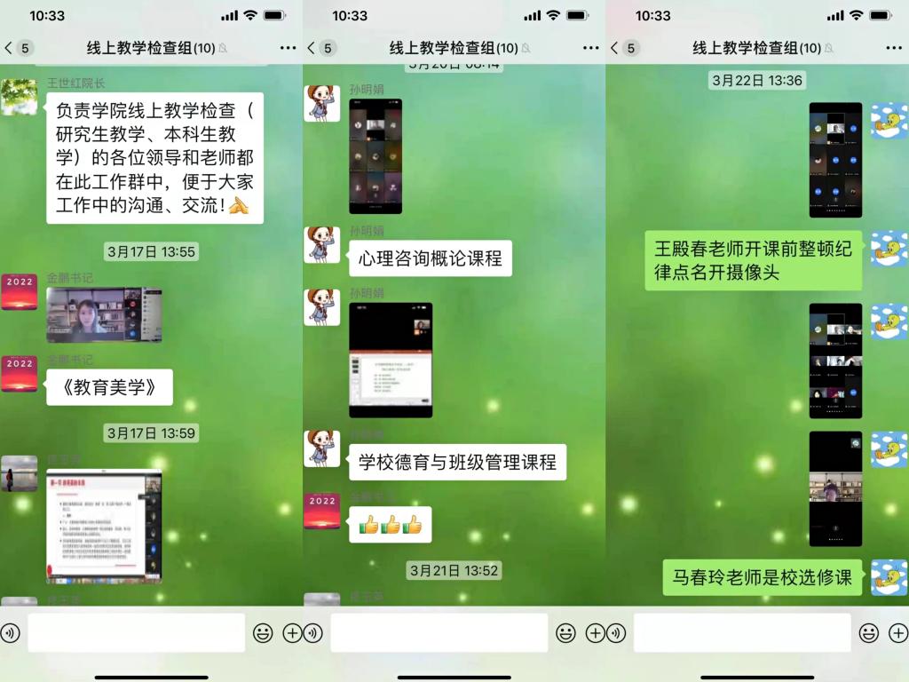 网课期间,为了解课堂授课情况、检验学生听课情况,成立线上教学领导组,由院领导班子、系主任、督导,教务员轮流进行线上听课,保证每节课都有人听课,听教师上课状态,查学生出勤,查学生听课效果,乐鱼