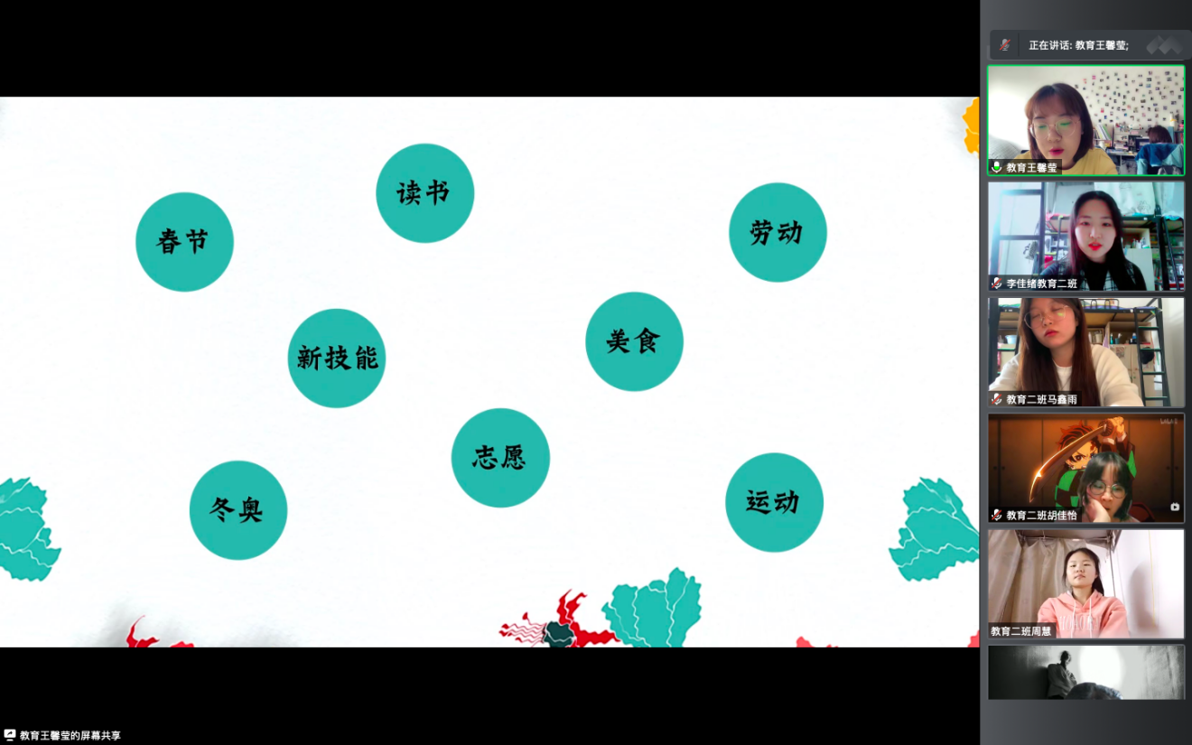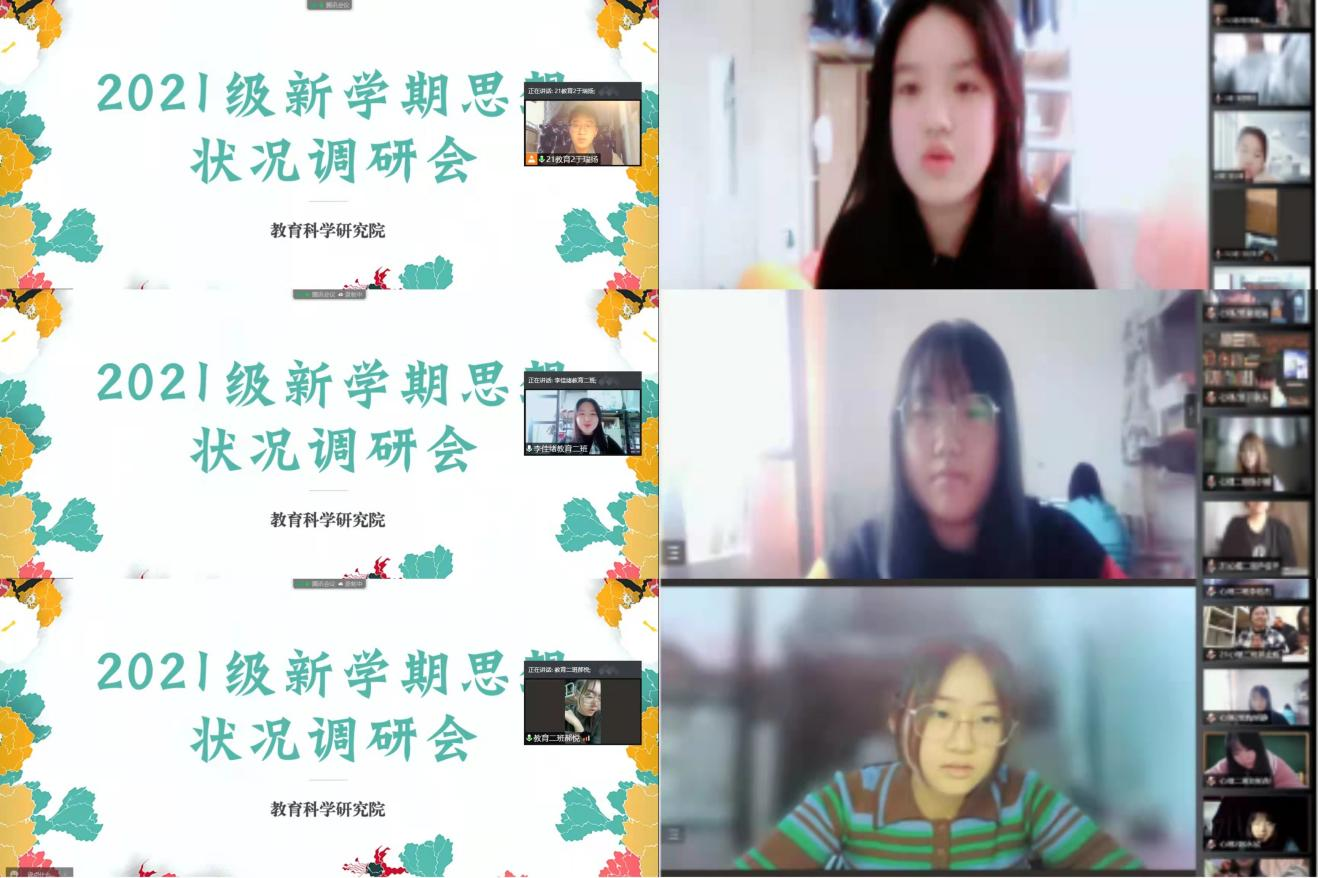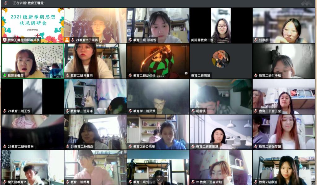 学生思想状况,了解其个人理想信念和对社会热点问题的关注,进一步制定、调整思想政治教育路线,帮助学生树立正确的价值观念,以正确的价值导向作为行动指南。2022年3月18日教育科学研究院在腾讯会议平台上开展2021级新学期思想状况调研会。本次调研会由2021级辅导员王馨莹老师主持,2021级教育2班、心理2班全体同学参会。