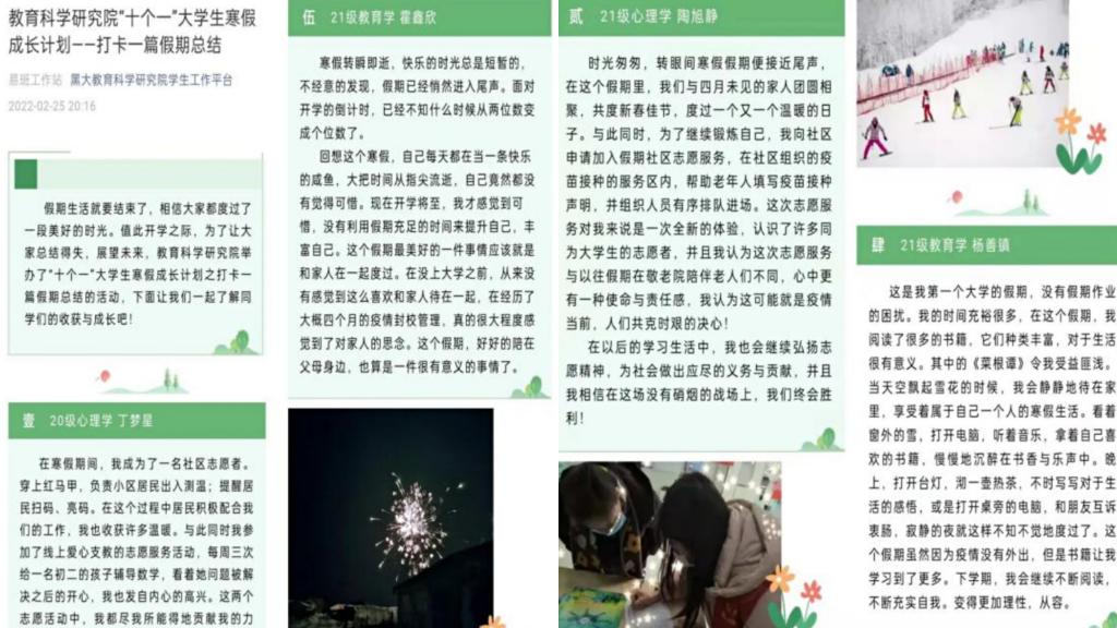 打卡假期感悟,留存成长时刻。梦想扬帆起航,未来雄心壮志,瞬间美好定格,感悟人生成长。丰子恺曾说:“不乱于心,不困于情,不畏将来,不念过往,如此,安好。”逝去的时光不可追回,记忆永远留存于心,更重要的是在此之中获得的人生经历和自我成长。通过这个活动看到同学们在假期的成长与变化,在不断成长中度过了一个美好充实的假期。(教育科学研究院供稿)