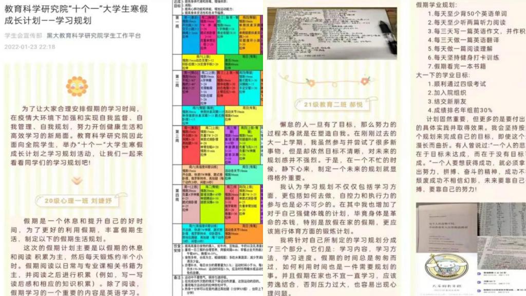 打卡学习规划,制定明确目标。“千里之行,始于足下。”为保持良好的学习习惯,合理安排假期的学习时间。教育科学研究院举办了学习规划活动,号召同学们制定寒假学习计划,总结经验,展望未来,用点滴积累来不断提升自己。通过规划,同学们更加明确了自己的学习目标,了解各自专业学习的方向。