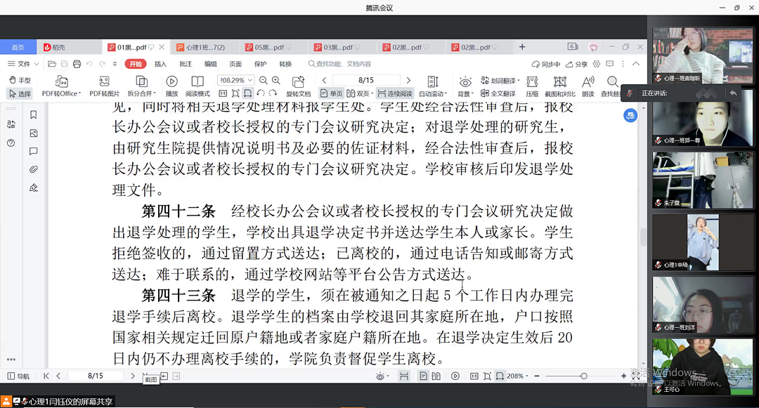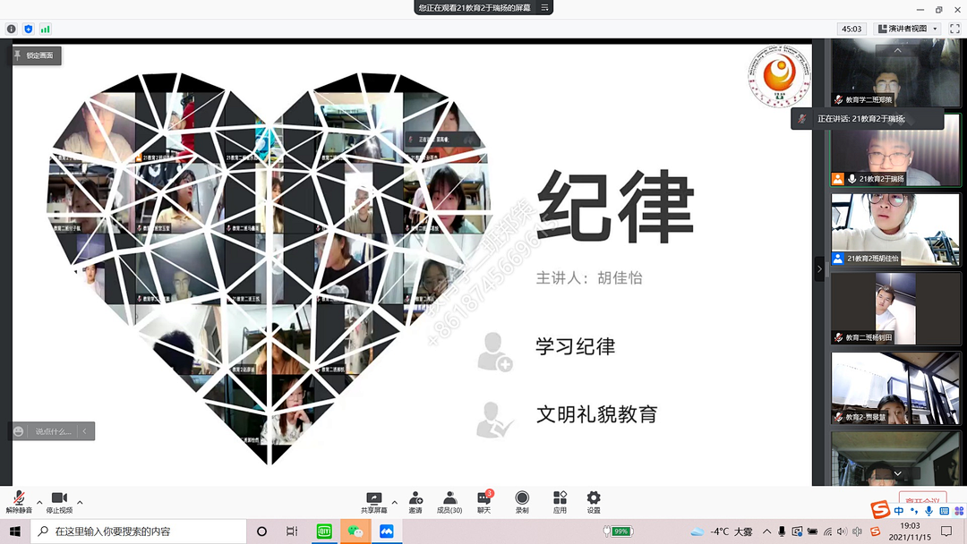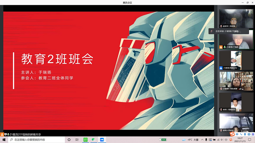 为了进一步帮助2021级新生更加科学地规划大学生活,明确学习目的并树立奋斗目标,2021年11月15日18时30分教育科学研究院于腾讯会议平台召开第二次班会,班会由2021级各班班长主持,各班班长、生活委员、学习委员主讲。本次班会共分为三个部分,分别为集体学习《乐鱼