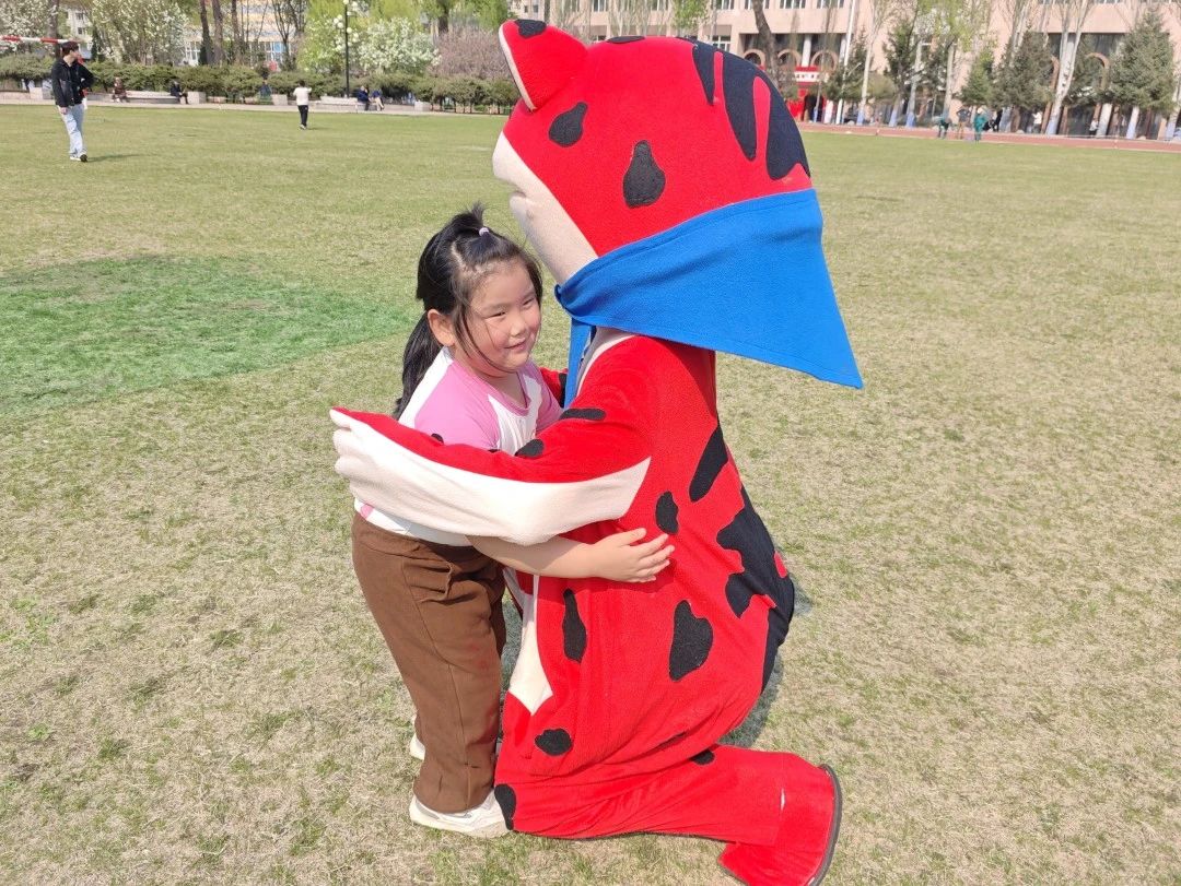 “蛙蛙”热情迎接参与者,通过拥抱、合影和操场游戏,迅速拉近与同学们及小朋友的距离,并送上“天天开心”的暖心祝福。