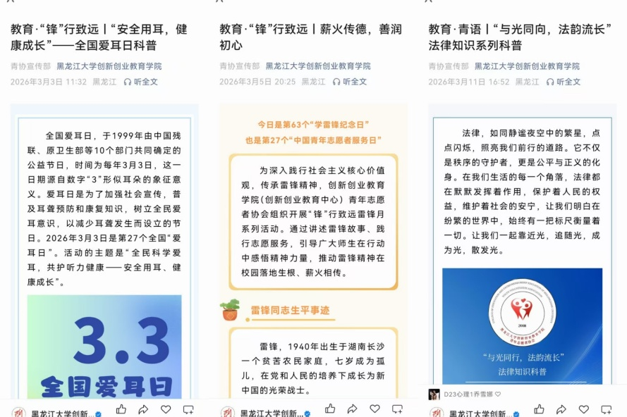 推出以“安全用耳、健康成长”为主题的科普推文,普及护耳知识;3月5日学雷锋纪念日,推出雷锋事迹科普推文,诠释雷锋精神时代内涵;3月11日上线法律科普推文,围绕罪罚刑解读实用法律知识,引导师生增强法治意识。线上推文营造了崇尚奉献、关爱健康、学法守法的良好氛围,让雷锋精神与科学理念深入人心。