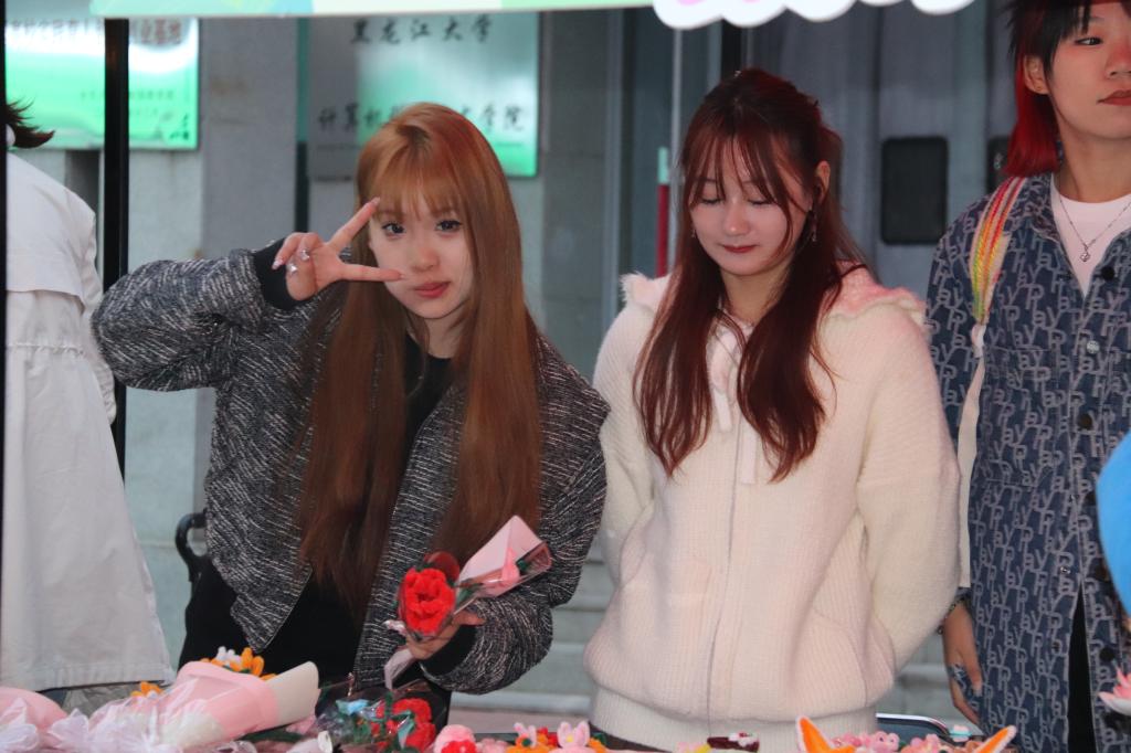 本次创意集市摊位商品丰富多样,有琳琅满目的首饰、精致的手作、可爱的摆件、芬芳的花卉和富含哲理的书籍。这些商品在灯串的映照下镀上了柔和的光晕。天气乍暖还寒,伴随着校园十佳歌手美妙的歌声,同学们热情高涨,创意集市人流如潮。